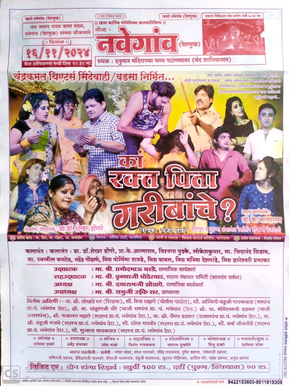 नवेगाव (देशमुख):-खास कार्तिक पौर्णिमेच्या काल्यानिमित्त जय जवान नाट्यकला मंडळ नवेगाव( देशमुख )यांच्या सौजन्याने चंद्रकमल थेटर्स शिंदेवाही/ वडसानिर्मित मा. संजय ठवरे यांच्या हस्तलिखित, प्राध्यापक शेखर डोंगरे यांच्या प्रमुख दिग्दर्शनाखाली तथा प्राध्यापक के. आत्माराम यांच्या प्रमुख मार्गदर्शनात महान सामाजिक ,कौटुंबिक ,विनोदी संगीत प्रधान तीन अंकी नाट्यप्रयोग” का रक्त पिता गरिबांचे”? या नाट्यप्रयोगाचे आयोजन भिवापूर तालुक्यातील नवेगाव( देशमुख) येथील हनुमान मंदिराच्या भव्य पटांगणावर बंद शामियानात दिनांक 16 नोव्हेंबर 2024 शनिवारी रात्रीला ठीक 10.30 वाजे केले आहे.