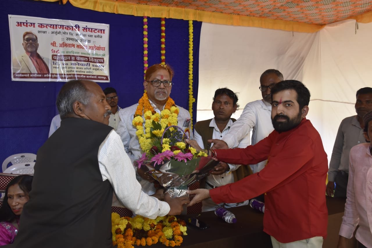 तालुका प्रतिनिधी:- दिव्यांग कल्याणकारी संघटना गोंदिया शाखा अर्जुनी मोरगाव च्या वतीने दि.20 जानेवारी 2025 रोज सोमवार ला कृषि उत्पन्न बाजार समिती सभागृह या ठिकाणी समाजसेवक मा. श्री. अमिताभ जी सांतरा साहेब नागपूर यांचा 58 वा वाढदिवस संघटनेच्या वतीने साजरा करण्यात आला.
