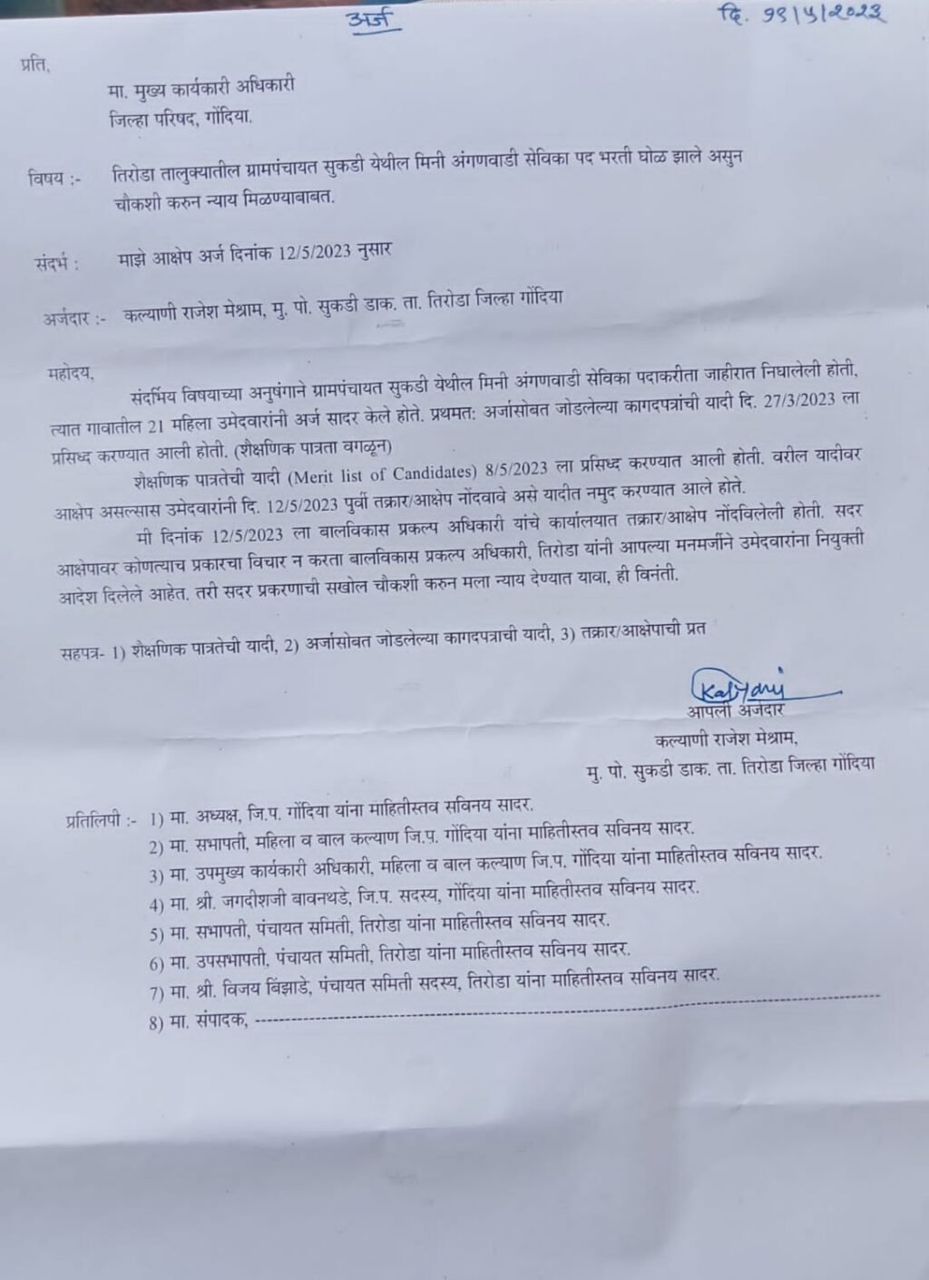 तिरोडा तालुक्यातील ग्राम पंचायत सुकडी (डाक.) येथे मिनी आंगणवाडी सेविका पद भरतीत घोळ, चौकशी करुन न्याय मिळून देण्याची उमेदवार अर्जदाराची...